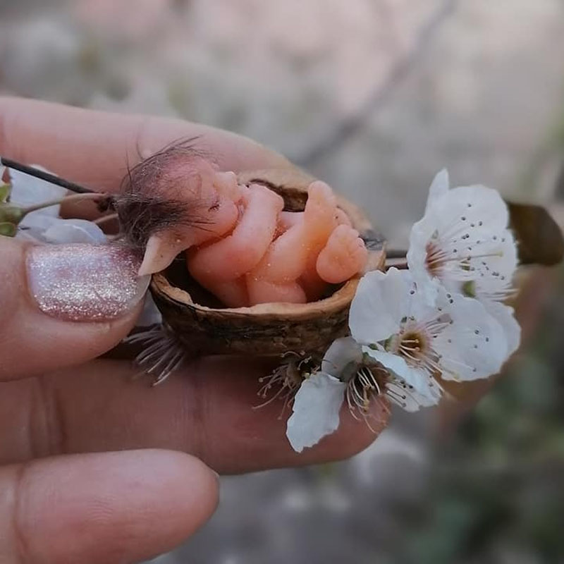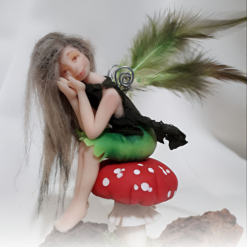 La muñeca hada es una figura encantadora y delicada, con un rostro dulce y expresivo. Sus ojos brillan como dos pequeñas gemas, y su cabello, suave y sedoso, cae en ondas doradas (o de colores fantasía como rosa o azul celeste). Viste un vestido brillante hecho de tul y lentejuelas, que parece estar tejido con hilos de luz de luna.
