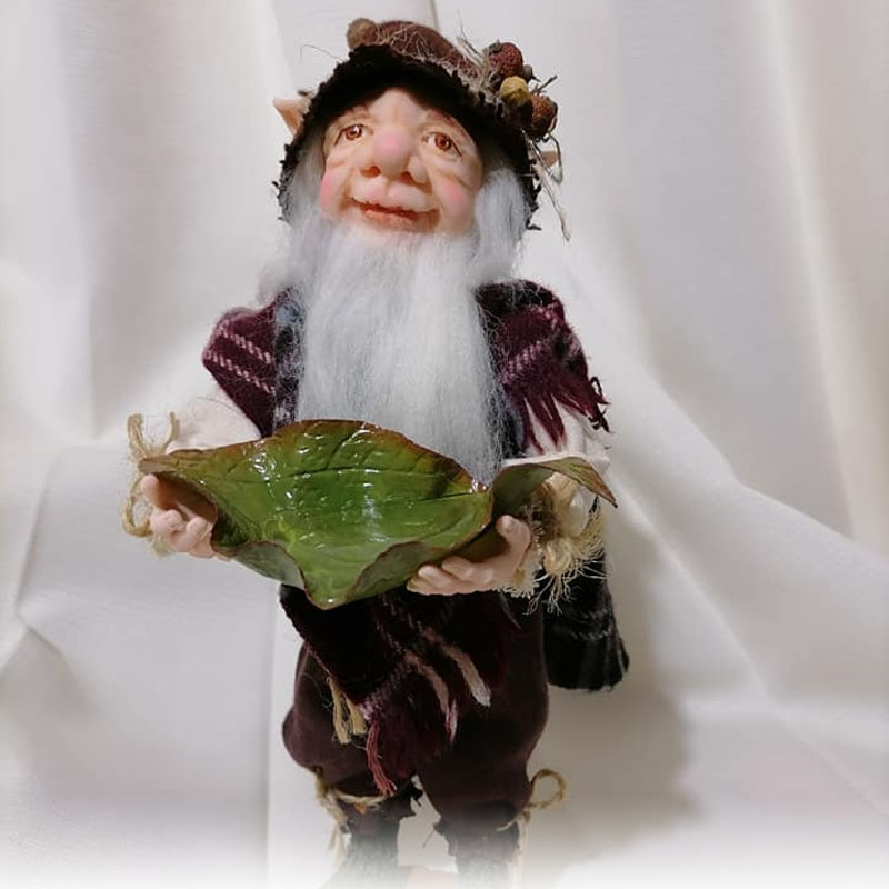 El duende viejo es una criatura menuda pero robusta, de espalda ligeramente encorvada por los años y con una expresión sabia que delata siglos de experiencias. Su rostro está surcado por arrugas profundas, especialmente alrededor de los ojos, que aún conservan un brillo travieso y una chispa de picardía. Su nariz es prominente y algo torcida, y de sus grandes orejas puntiagudas cuelgan pequeños amuletos o aretes de cobre y madera.